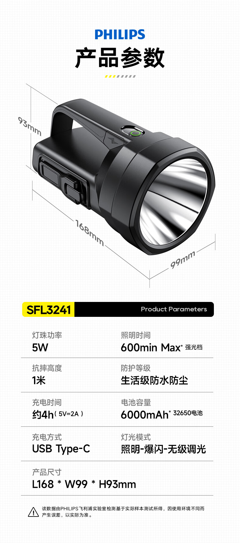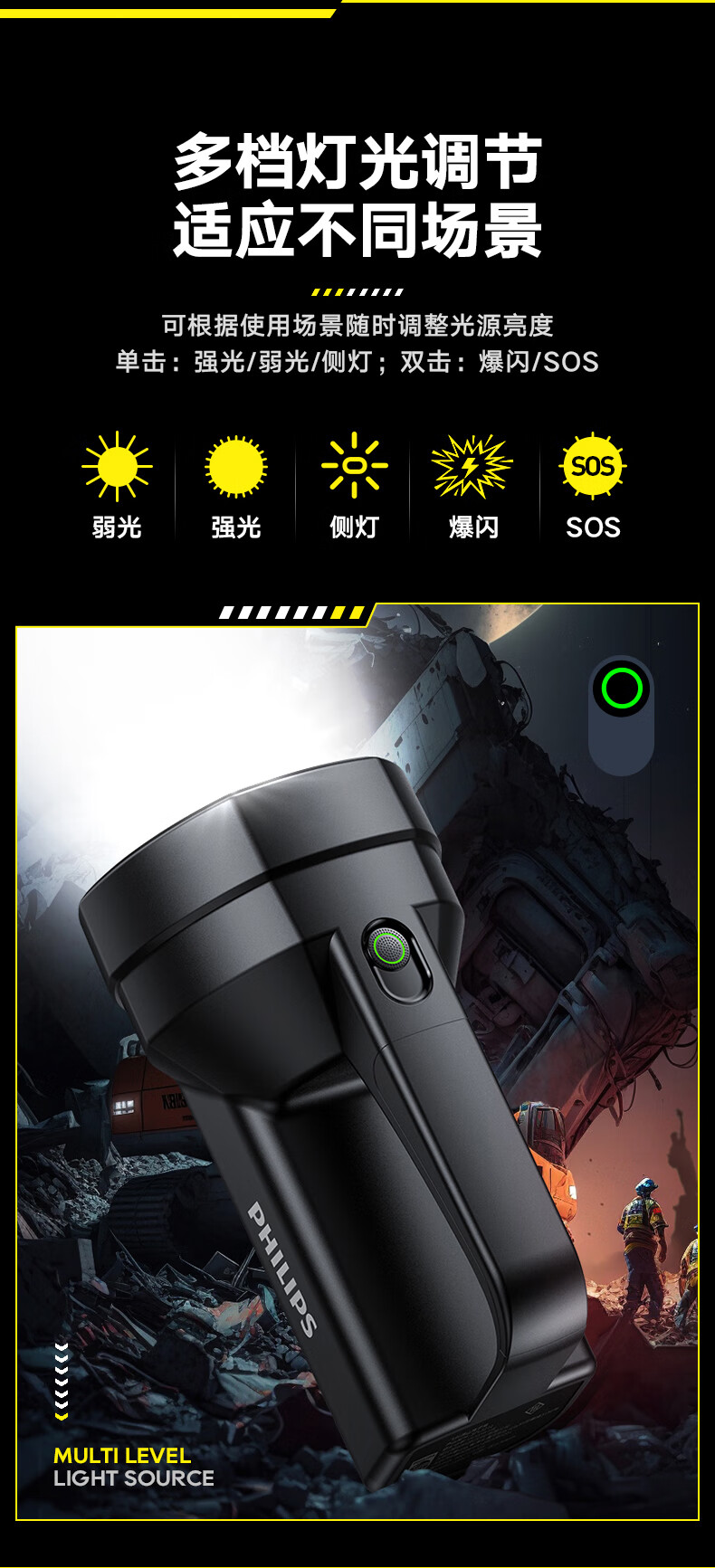 飞利浦(PHILIPS)手电筒强光手电超亮超长续穿天家用小型军户外照明应急灯SFL2247